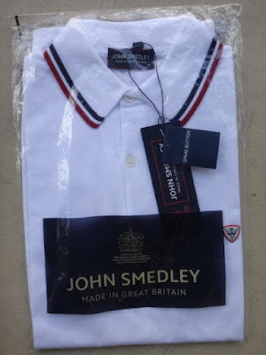 John Smedley White Polo Shirt With Navy & Red Stripes S